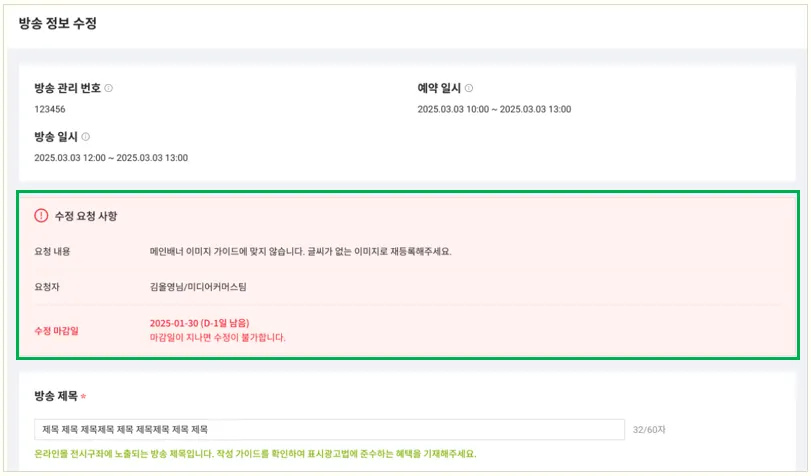 수정이 필요한 사항에 대해 파트너 오피스-’방송 정보 등록’ 페이지와 협력사 담당자 메일 통해 안내 드릴 예정이오니, 참고 하시어 수정된 정보를 등록, 제출 해주세요.