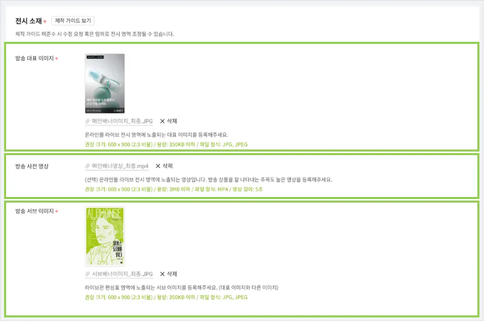 대표 이미지는 라이브관 온에어 배너에, 서브 이미지는 라이브관 온에어 배너 하단 편성표에 노출됩니다.