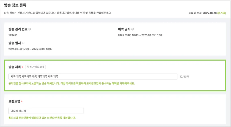 방송 제목은 앱 내 넛지와 방송 플레이어 상단에 노출되는 문구입니다.
