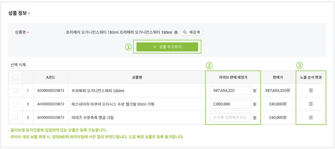 ① 방송에 노출될 상품을 추가합니다. 사전에 MD님과 상의한 상품만 등록해주세요.
