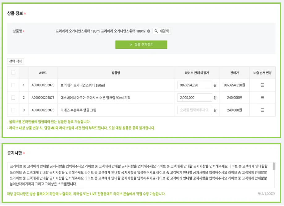 올리브영 앱 내 라이브관 및 라이브 플레이어에 노출될 방송 제목, 상품정보, 공지사항 등 등록이 필요합니다.