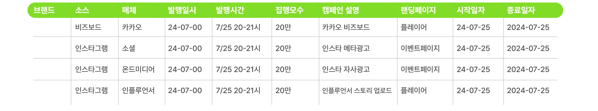 방송 관련 외부광고 집행 시, 광고 별 정보를 아래 표 형태로 올영라이브 담당PD에게 전달해주세요! 사전 공유 必